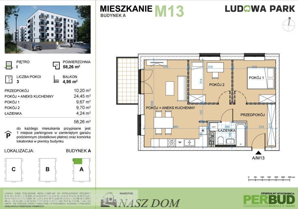 Niniejsza oferta przedstawia mieszkanie o powierzchni 58,26m2, które zlokalizowane będzie na I piętrze.