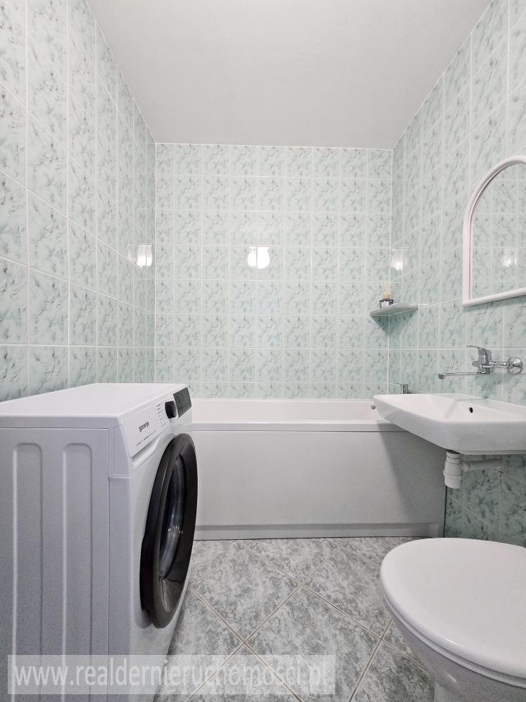 ** łazienkę wyposażoną w wannę i pralkę.